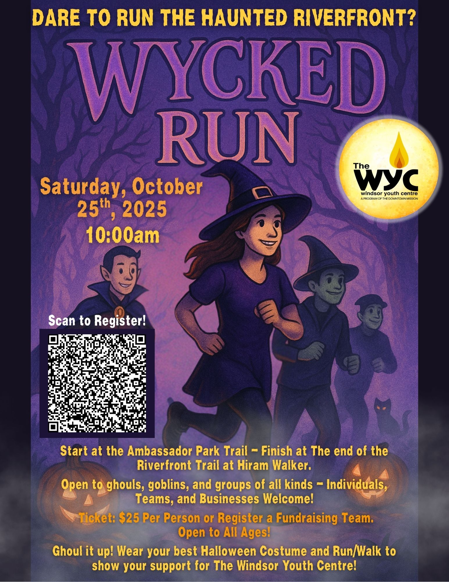 Saturday, October 25, 2025 Registration: 9:30 AM | Run/Walk Start: 10:00 AM Ambassador Park Trail – Windsor Riverfront Tickets: $25 – Register at: https://bit.ly/46ZUqXu Celebrate Halloween and support local youth...