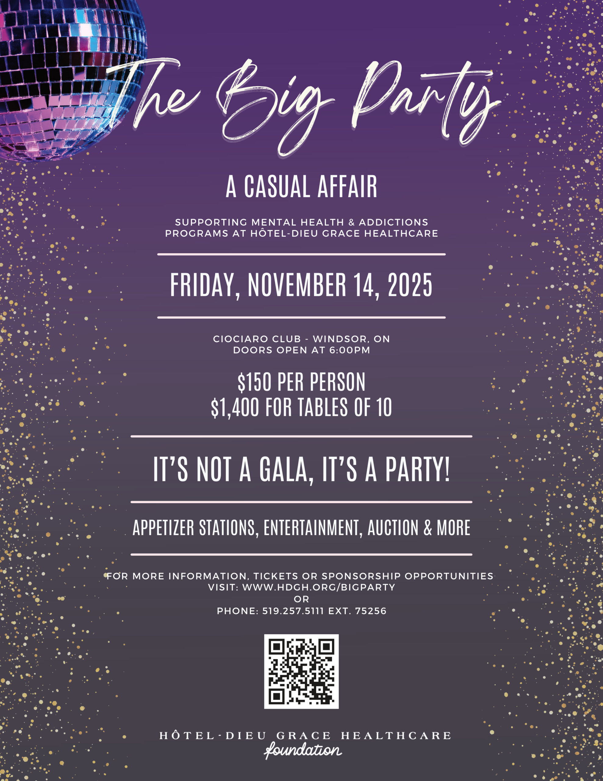 Hôtel-Dieu Grace Healthcare Foundation invites you to “Party with a Purpose” at The Big Party, in support of the Mental Health and Addictions Programs at Hôtel-Dieu Grace Healthcare (HDGH). The...